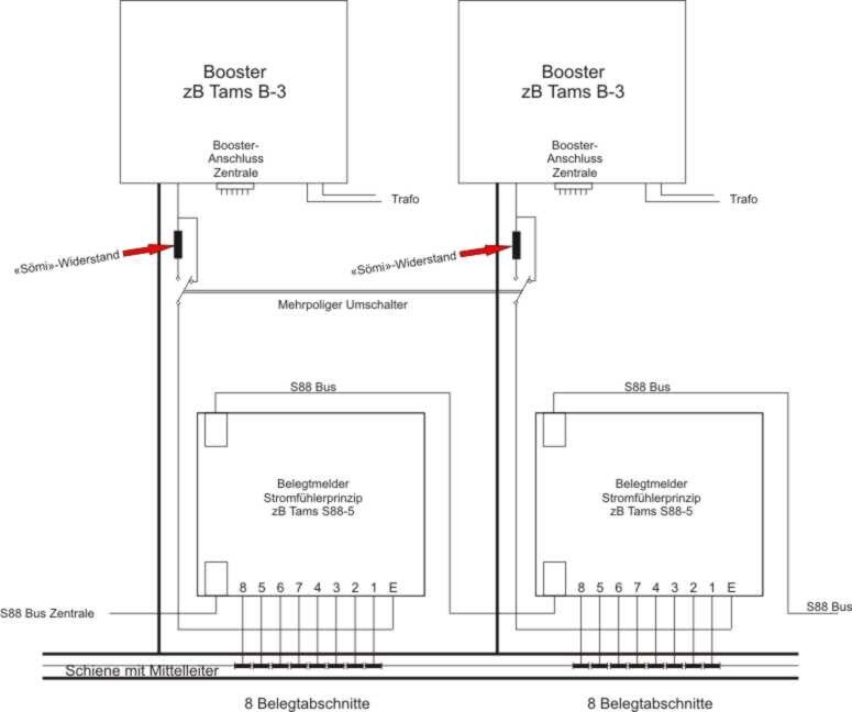 Ueber einen mehrpoligen Umschalter werden die Fahrspannungen von den Boostern auf die Belegtmelder-Eingänge geführt. Nach einer Kurzschluss-Abschaltung wird während dem vorhandenen Kurzschluss mit diesem Umschalter ein berechneter "Sömi"-Widerstand zwischen die Ausgänge der Booster geschaltet. Damit wird die Digitalspannung von allen Boostern reduziert, damit beim Kurzschluss nur noch ein Strom von ca 10 mA fliessen kann.
