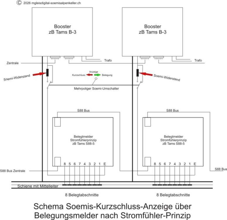 Bei meiner Modellbahn mit Tams S88-5 Belegtmeldung wird bei Kurzschluss mit einem Umschalter die normale Digitalspannung über einen berechneten Soemi-Widerstand, also nur ein winziger Teil der Digitalspannung auf die Anlage geleitet. So kann nur beim Abschnitt mit dem Kurzschluss ein minimaler Strom fliessen, welcher für eine normale Belegtanzeige gerade noch genügt und somit punktgenau für Soemis- Kurzschluss-Anzeige sorgen. Der Soemi-Widerstand beträgt für Märklin bei 19V ca 1,9 kOhm. Bei 19 Volt fliesst somit bei Kurzschluss über den Widerstand ein Strom von ca 10mA, was für die besagte Belegtmeldung genügt.